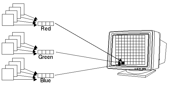 A computer-graphics monitor emulates visible colors by lighting pixels with a combination of red, green, and blue light in proportions that excite the red-, green-, and blue-sensitive cones in the retina in such a way that it matches the excitation levels generated by the photon mix it's trying to emulate. If humans had more types of cone cells, some that were yellow-sensitive for example, color monitors would probably have a yellow gun as well, and we'd use RGBY (red, green, blue, yellow) quadruples to specify colors. And if everyone were color-blind in the same way, this chapter would be simpler.